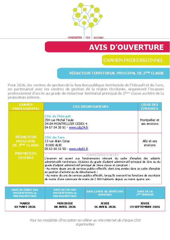 Le centre de gestion de la fonction publique territoriale de l’Hérault, en partenariat avec les Centres de gestion de la fonction publique territoriale de la région Occitanie, organise en 2026, l'examen professionnel d'accès au grade de rédacteur territorial principal de 2ème classe, au titre de la promotion interne, session 2026.